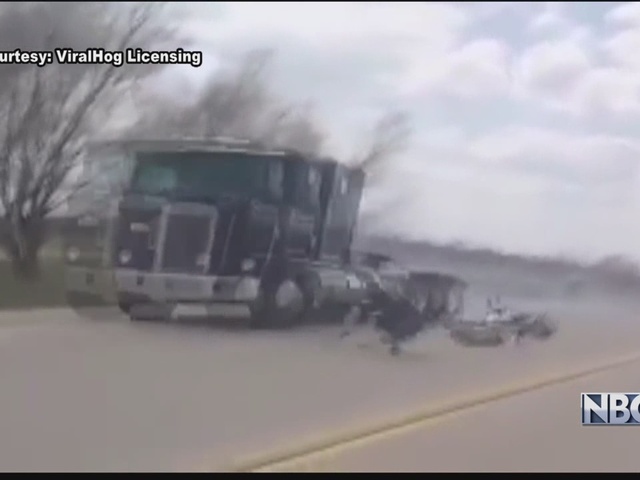 Meyer can be seen jumping away from the semi after a fellow rider strikes the dog.