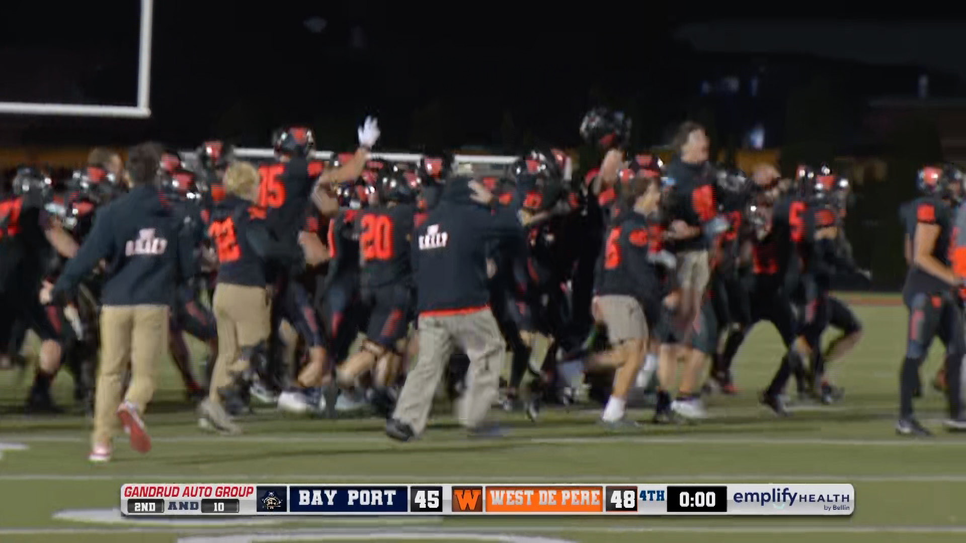 The Phantoms found themselves down 45-28 in the fourth quarter, but made an epic comeback scoring 20 points in the last four minutes, as Patrick Gresien threw three touchdowns and unbelievably West De Pere recovered two onside kicks. With 18 seconds left Greisen threw a short touchdown to Braylon Stegall for the game-winning score.