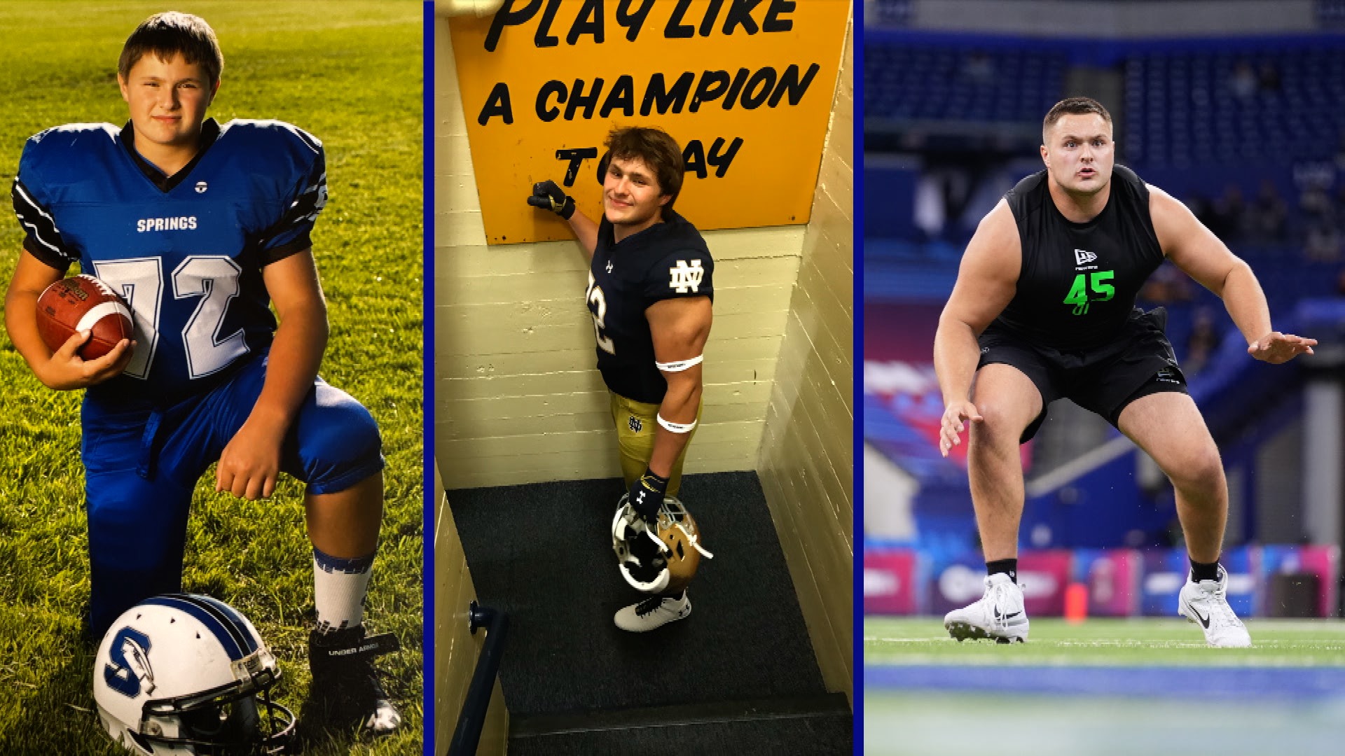 He had Division I offers from all over the country, and went on to play at Notre Dame, where he became a captain for the Fighting Irish while continuing his development toward the NFL level.