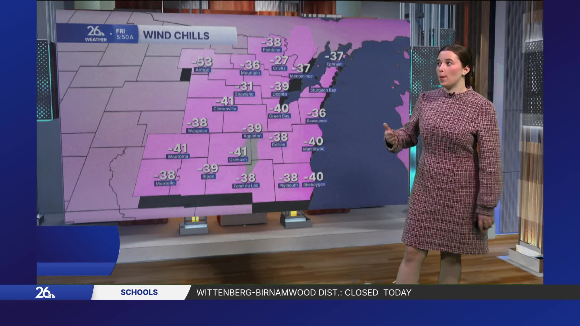 Overnight will be just as cold as this morning, with temperatures dropping into the negative teens. Winds will be calmer, so wind chills will be less harsh, mainly in the negative twenties. It will remain very cold, but there will be some relief.