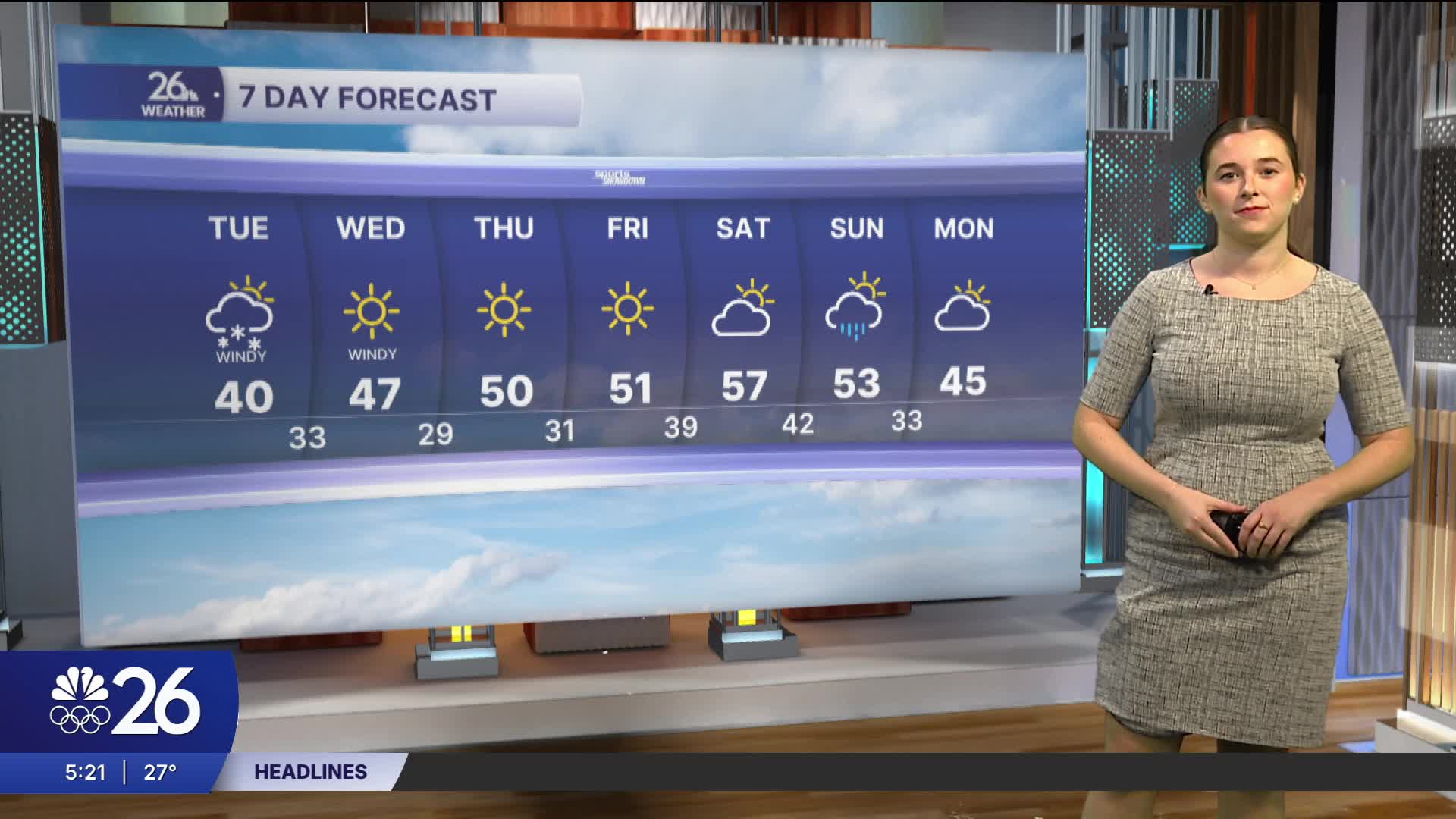 After this morning’s brief chance for snow, conditions will stay mostly calm for the remainder of the work week. However, it will be windy, expect wind gusts around 30 miles per hour today and tomorrow.