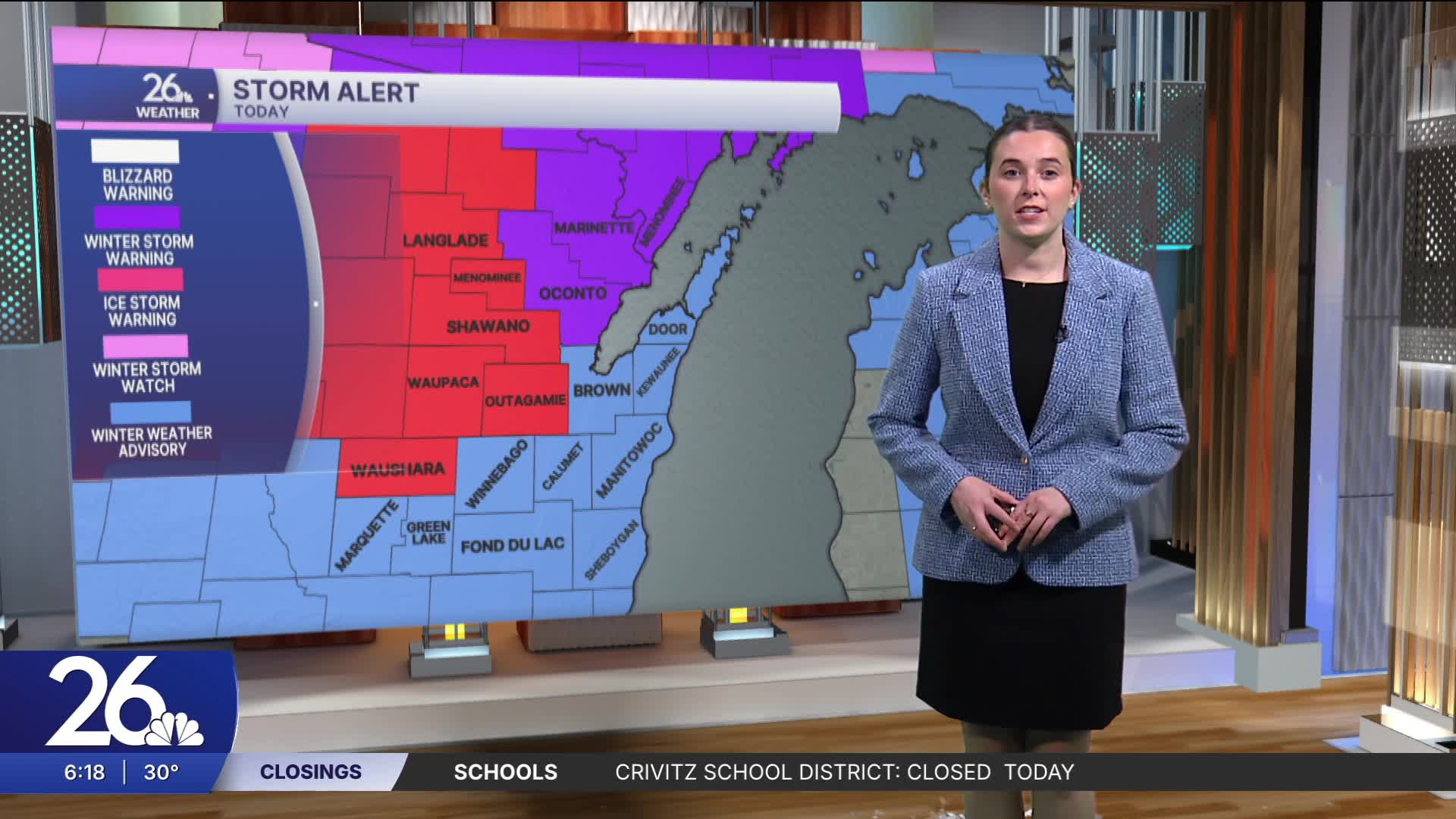 There are ice storm warnings, winter storm warnings, and winter weather advisories in effect across northeast Wisconsin this morning. Freezing rain and sleet are falling and will continue into the morning. Areas under warnings could see between 0.25–0.50” of ice accumulation, while other areas may see 0.10–0.25”. Slick roads will be an issue early today, with tree damage and power outages possible, especially in areas with higher ice accumulation.