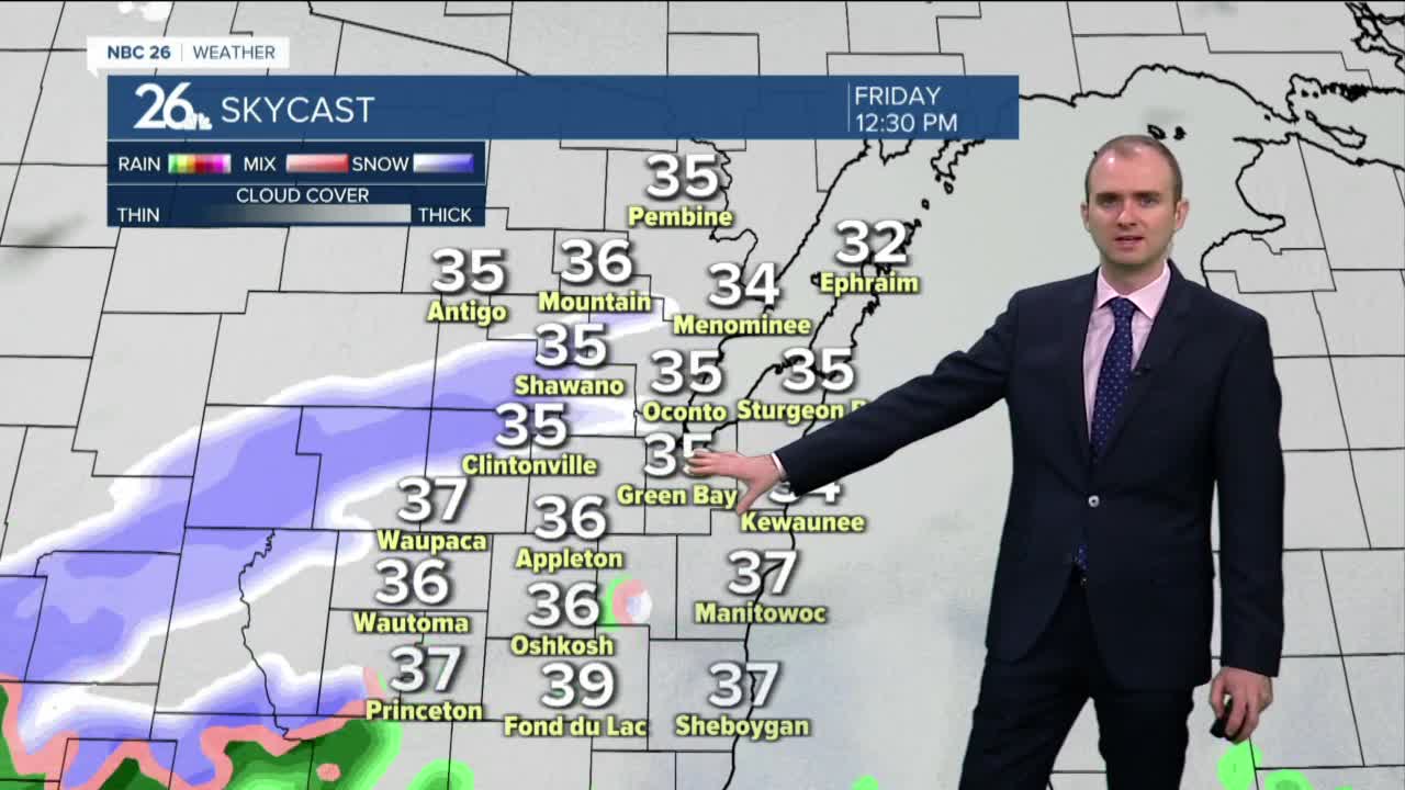 An area of low pressure is going to bring a wintry mix and snow to the after starting later this morning and continue on and off for most of the day. One thing that will make it difficult for the snow to accumulate will be the air temperature. With highs in the mid to upper 30s, this will be a slushy wet heavy snow that will melt while it falls.