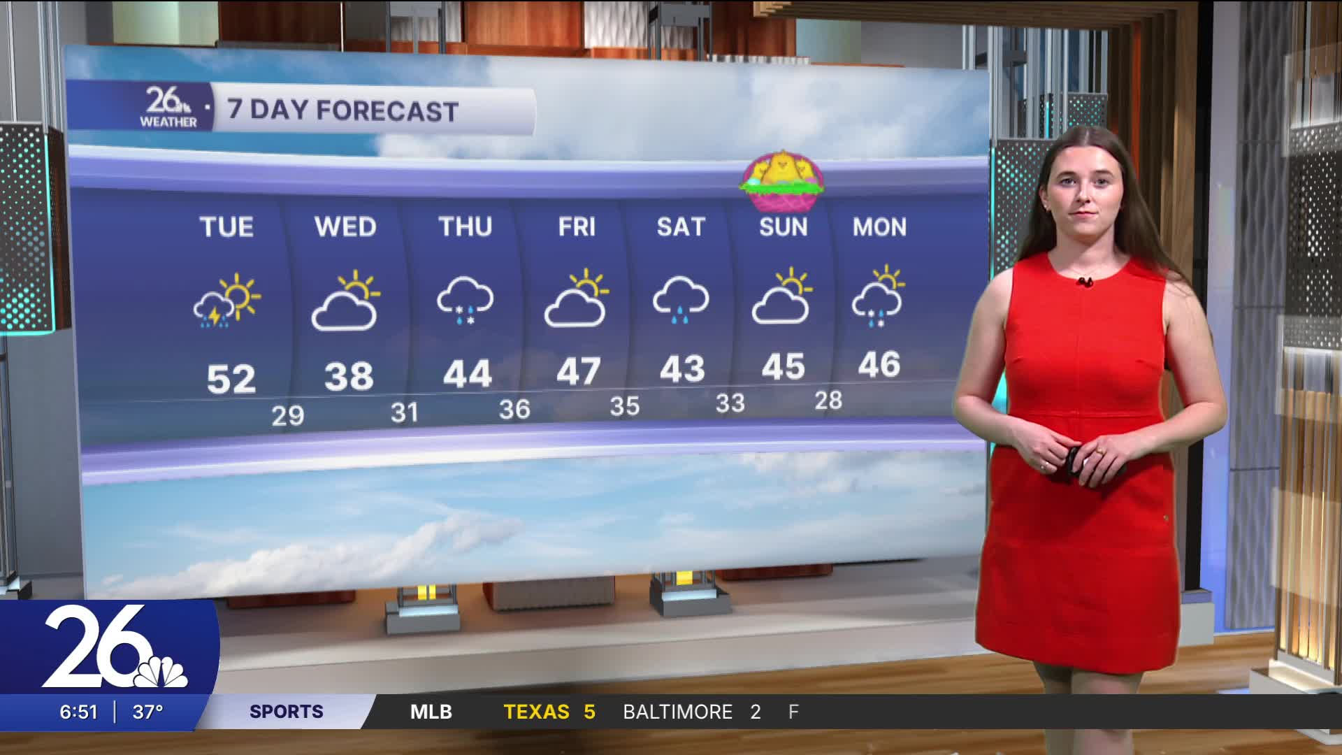 Last night, thunderstorms moved through, bringing rain and hail, and we have another chance for thunderstorms today. There is a Level 1 (marginal) risk for severe storms, with the main hazard being hail around one inch in diameter. Scattered showers will begin this morning and continue into the evening, with a few potentially becoming severe. High temperatures will reach the low 50s later this afternoon.