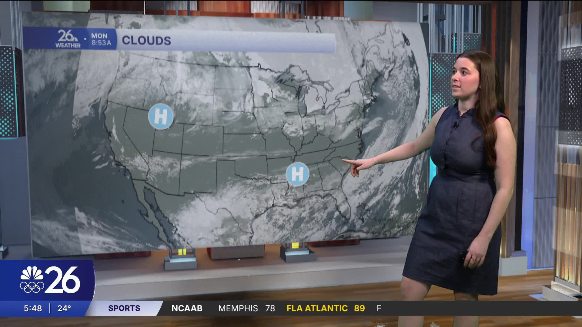 We start off the workweek on a nice note. We will enjoy sunny skies for most of Monday. Winds from the southwest will help bring in warmer air, allowing temperatures to reach the mid to upper 30s. While this wind will bring warmer air, it will also create wind chills, so it may feel a bit colder at times.