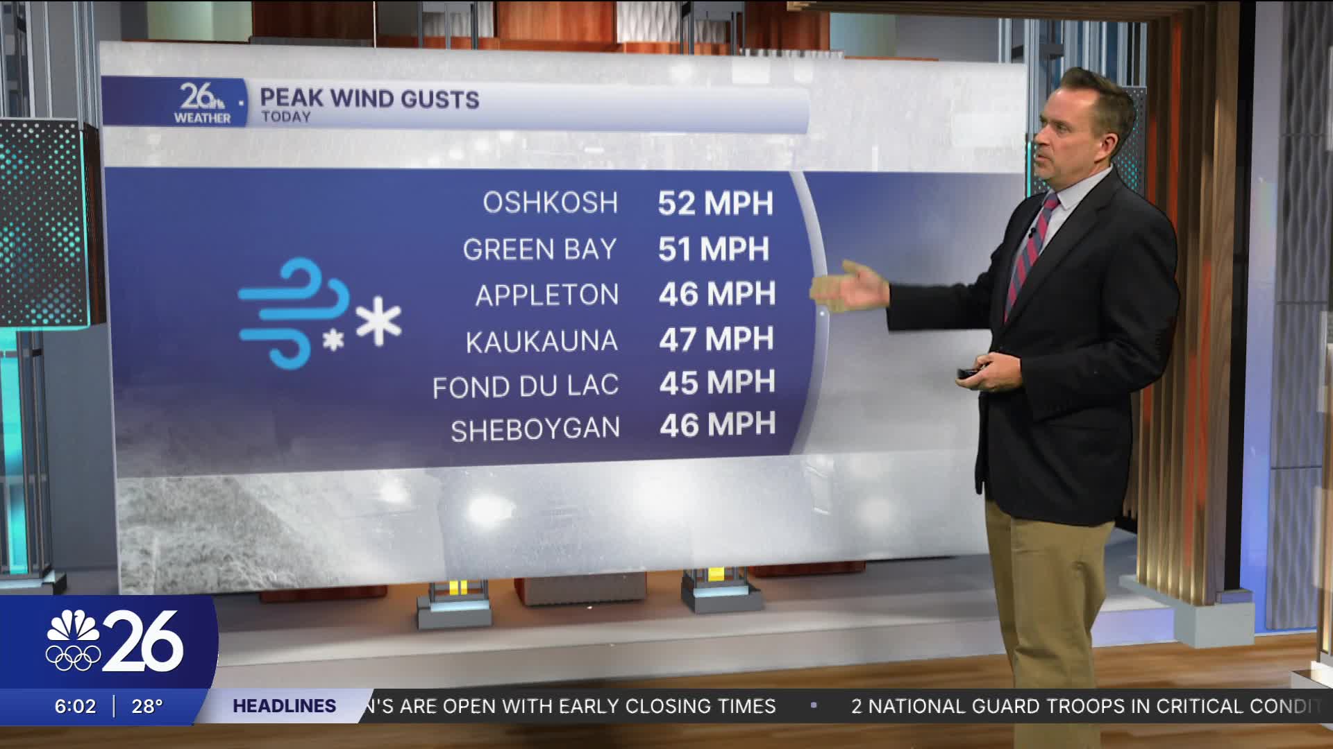 Gusty NW winds of 45 to 55 mph at times & snow replaced the mild weather we've been experiencing.