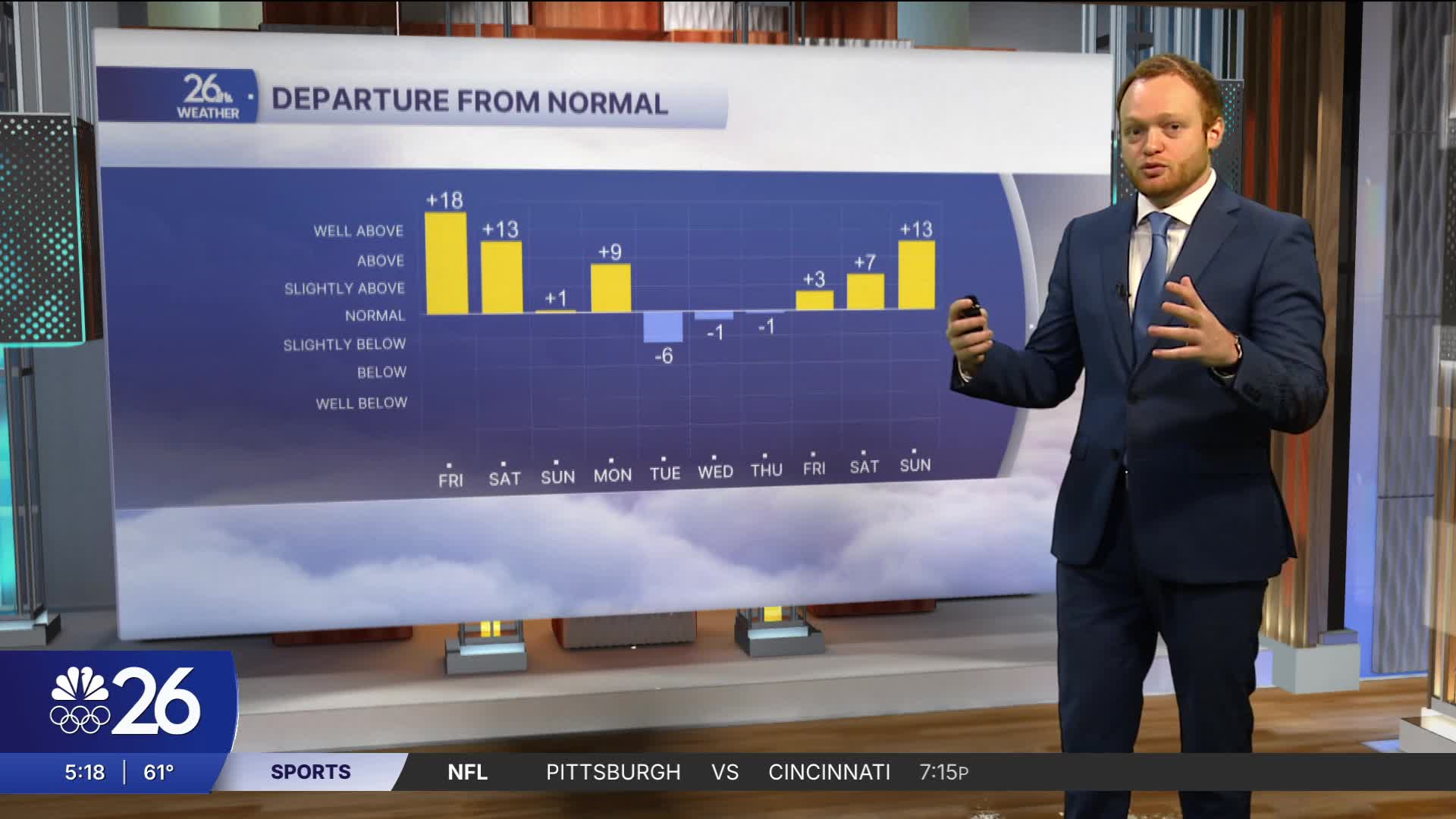 Friday will see highs reach the low/mid 70s, far above normal, along with gusty winds.