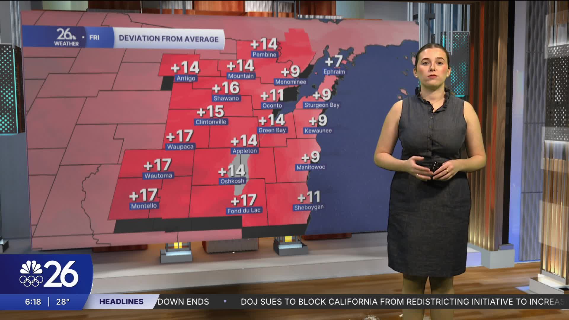 We have another beautiful, sunny day ahead of us, with temperatures reaching into the upper 50s this afternoon, some places getting to 60. Overnight, clouds will move in, and there is a chance for showers in the morning. Rain will be light, resulting in minimal totals. This rain comes with a cold front, but before the cold settles in, temperatures will get near 60 degrees. Over the next two days, temperatures will be 10–20 degrees above normal.